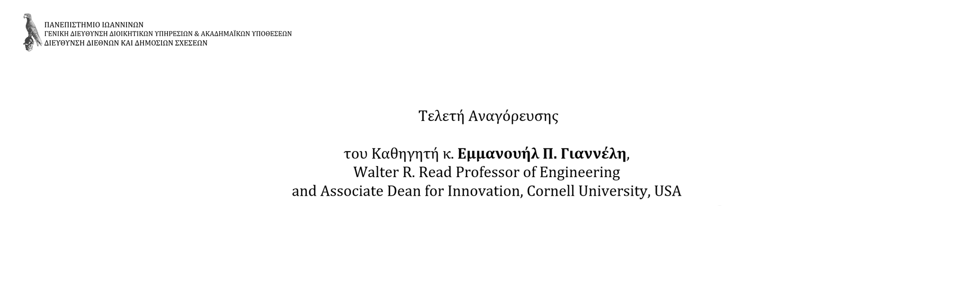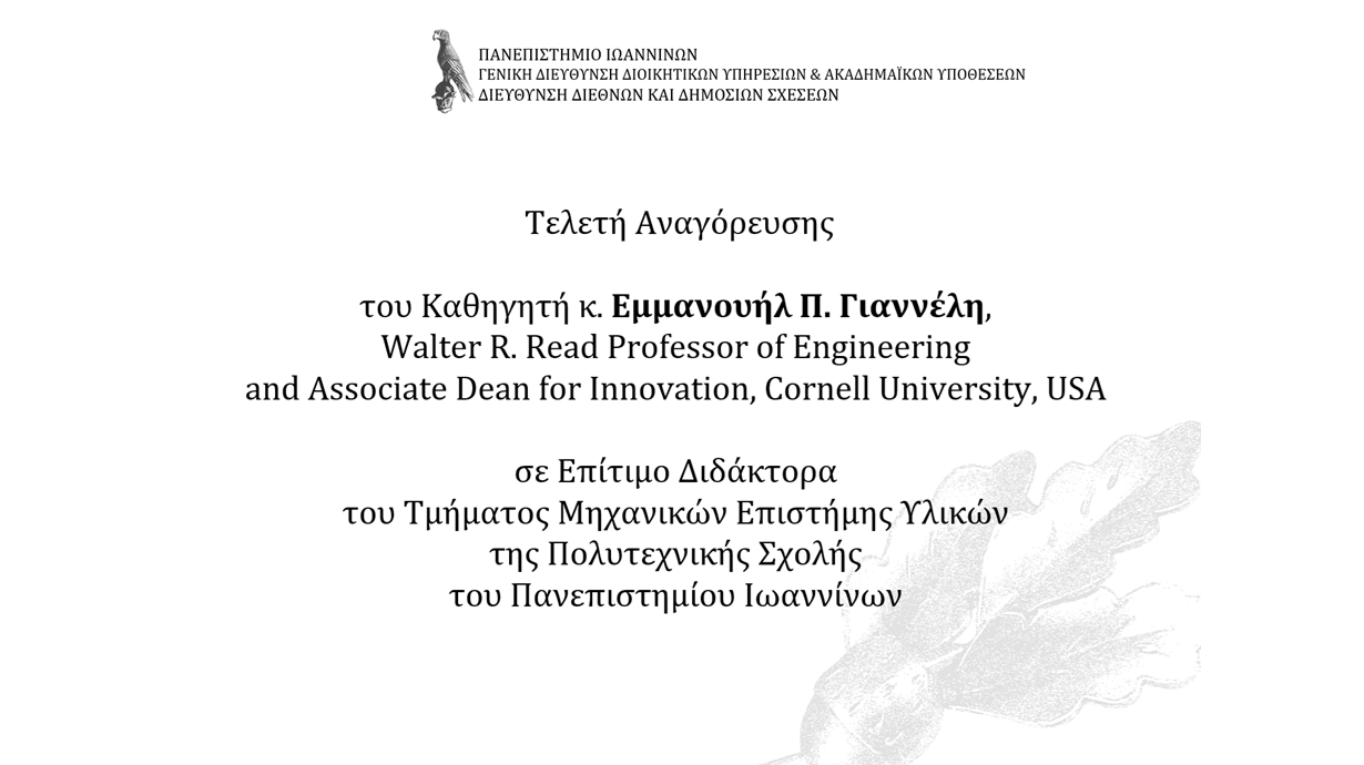 Η Πρύτανης του Πανεπιστημίου Ιωαννίνων, Καθηγήτρια κυρία Άννα Κ. Μπατιστάτου, έχει την τιμή να σας προσκαλέσει στην Τελετή Αναγόρευσης του Καθηγητή κ. Εμμανουήλ Π. Γιαννέλη, Walter R. Read Professor of Engineering and Associate Dean for Innovation, Cornell University, USA, σε Επίτιμο Διδάκτορα του Τμήματος Μηχανικών Επιστήμης Υλικών του Πανεπιστημίου Ιωαννίνων.