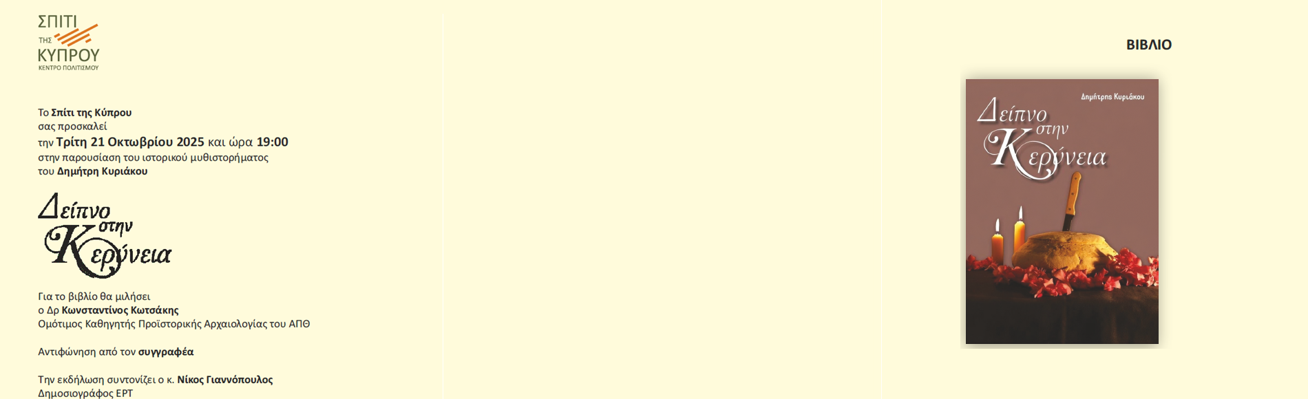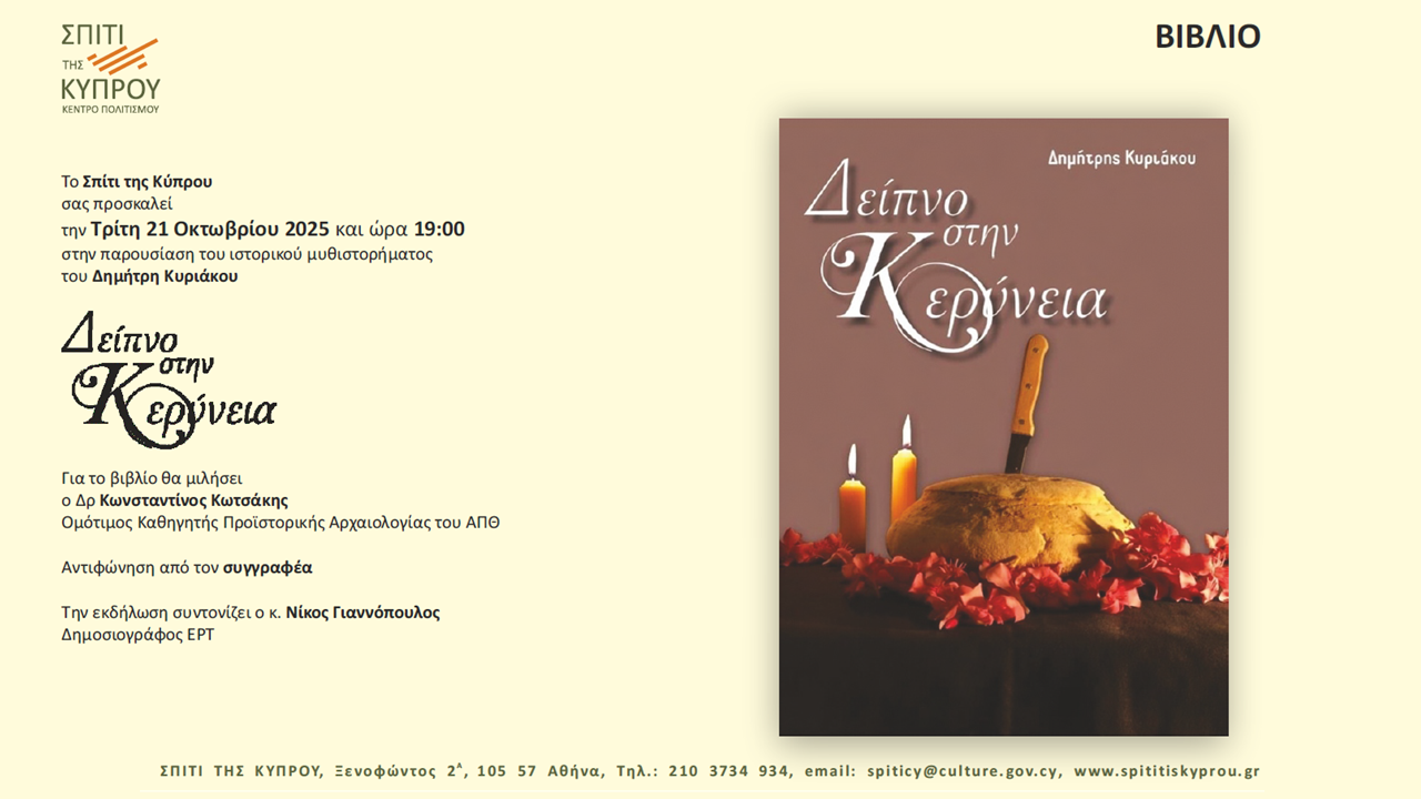 Το Σπίτι της Κύπρου σας προσκαλεί την Τρίτη 21 Οκτωβρίου 2025 και ώρα 19:00 στην παρουσίαση του ιστορικού μυθιστορήματος του Δημήτρη Κυριάκου : «ΔΕΙΠΝΟ ΣΤΗΝ ΚΕΡΥΝΕΙΑ»