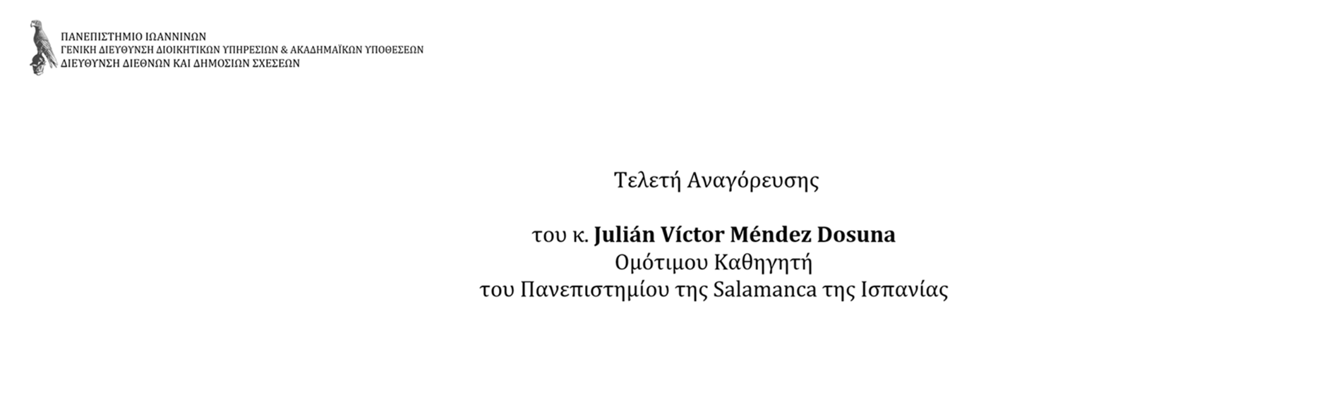 Η Πρύτανης του Πανεπιστημίου Ιωαννίνων, Καθηγήτρια κυρία Άννα Κ. Μπατιστάτου, έχει την τιμή να σας προσκαλέσει στην Τελετή Αναγόρευσης του κ. Julián Víctor Méndez Dosuna, Oμότιμου Καθηγητή του Πανεπιστημίου της Salamanca της Ισπανίας σε Επίτιμο Διδάκτορα του Τμήματος Φιλολογίας της Φιλοσοφικής Σχολής του Πανεπιστημίου Ιωαννίνων.