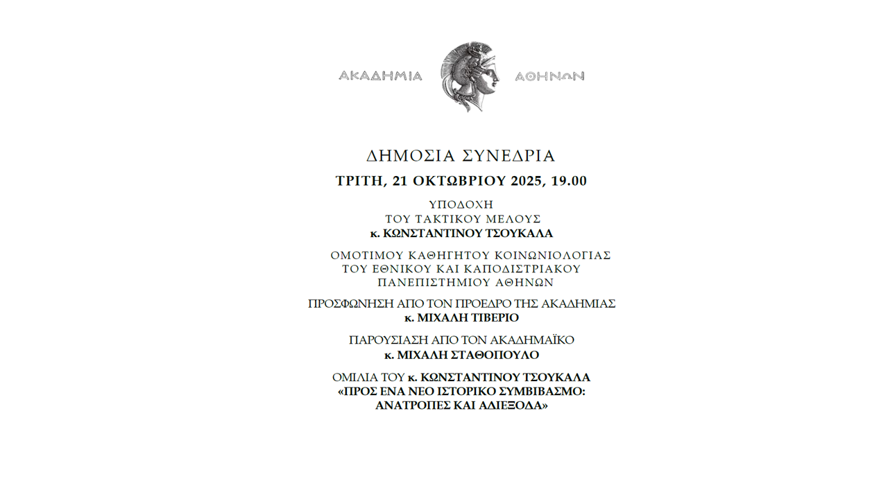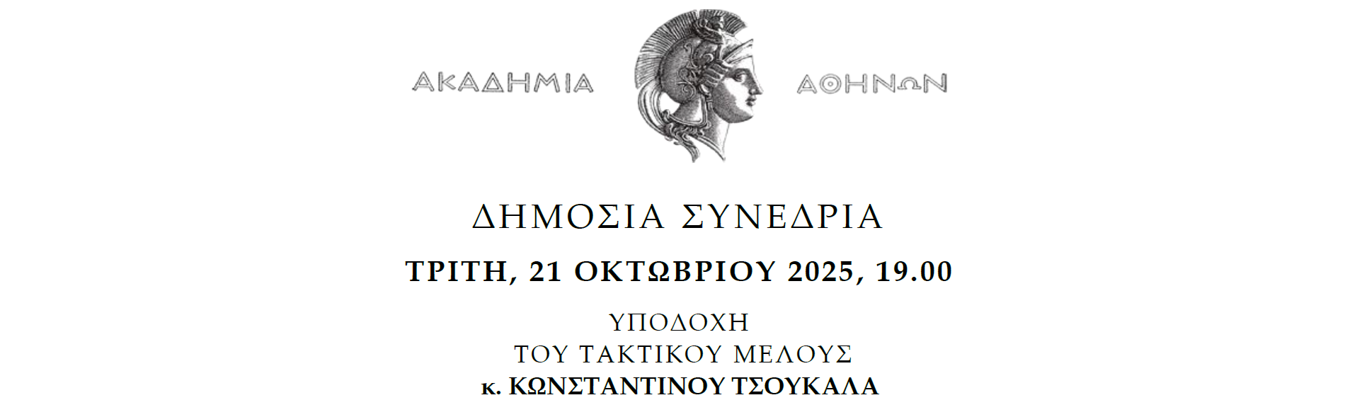 Δημόσια συνεδρία υποδοχής του κ. Κωνσταντίνου Τσουκαλά, Ομότιμου Καθηγητή Κοινωνιολογίας του Εθνικού και Καποδιστριακού Πανεπιστημίου Αθηνών, ως τακτικού μέλους της Ακαδημίας Αθηνών. Η συνεδρία θα πραγματοποιηθεί την Τρίτη, 21 Οκτωβρίου 2025 και ώρα 19.00, στην Αίθουσα Τελετών.