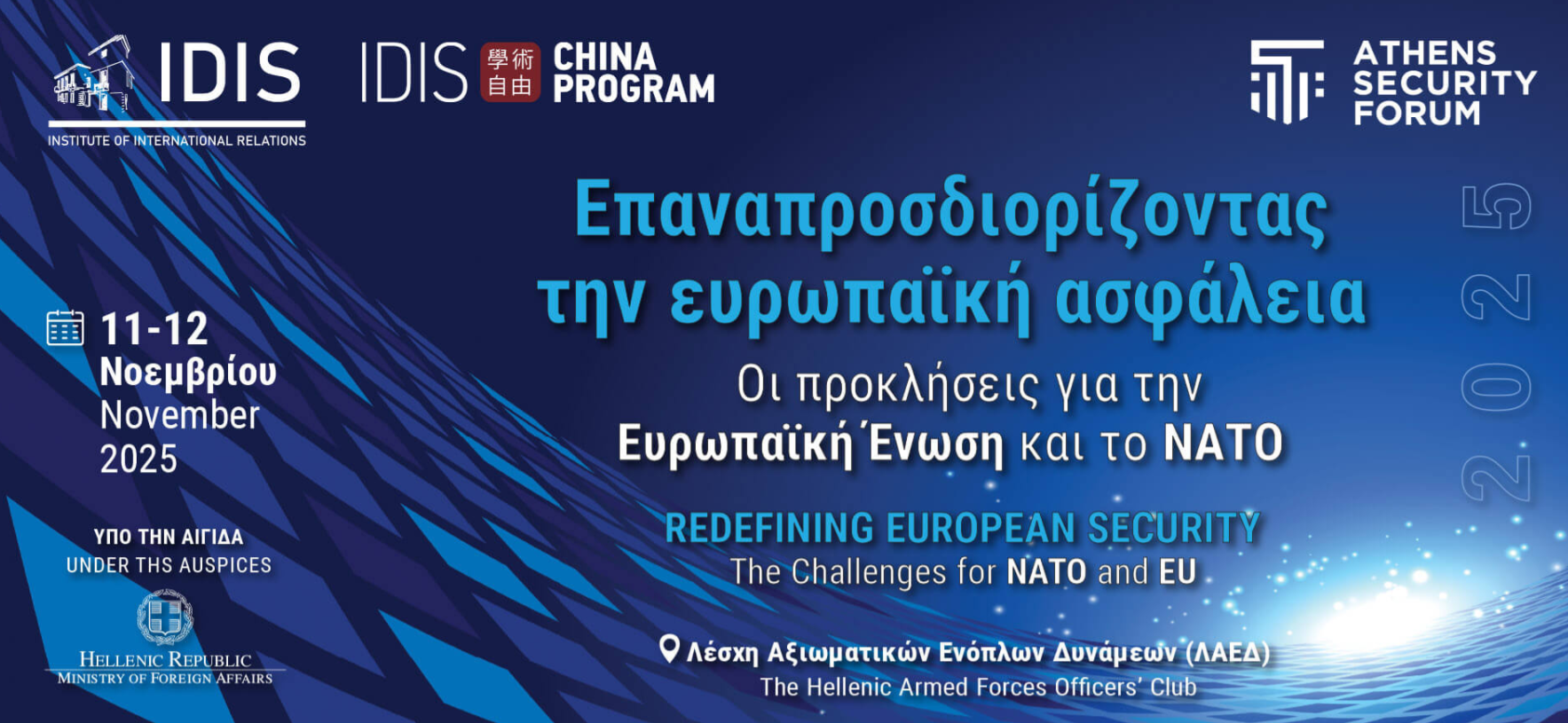 Το Athens Security Forum, η κορυφαία ετήσια συνάντηση του Ινστιτούτου Διεθνών Σχέσεων (ΙΔΙΣ), διοργανώνεται φέτος σε μια εξαιρετικά κομβική για την ευρωπαϊκή και ευρω-ατλαντική ασφάλεια συγκυρία και θα δώσει ιδιαίτερη έμφαση στις ανακατατάξεις στην ήπειρο μας και την Ανατολική Μεσόγειο. Στο σταυροδρόμι των συγκρούσεων στη Μέση Ανατολή και την Ουκρανία, η περιοχή βρίσκεται αντιμέτωπη με την αναθεώρηση στρατηγικών προτεραιοτήτων, συμμαχιών και αντίληψης απειλών. Το Athens Security Forum 2025 θα διερευνήσει πως περιφερειακοί παράγοντες, κρατικοί και μη, επανατοποθετούνται σε ένα μεταβαλλόμενο γεωπολιτικό τοπίο. Στην ατζέντα του θα βρεθούν ζητήματα στρατηγικής, αλληλεξάρτησης, συσχετισμού δυνάμεων, και θα εξετασθεί πως η μεταβαλλόμενη δυναμική ισχύος αναδιαμορφώνει το περιβάλλον ασφαλείας στη νότια Ευρώπη. Θα συζητήσουν για τα κρίσιμα αυτά ζητήματα έγκυροι αναλυτές, πολιτικοί και ακαδημαϊκοί από την Ελλάδα και κορυφαία αμερικανικά και ευρωπαϊκά επιστημονικά ιδρύματα .