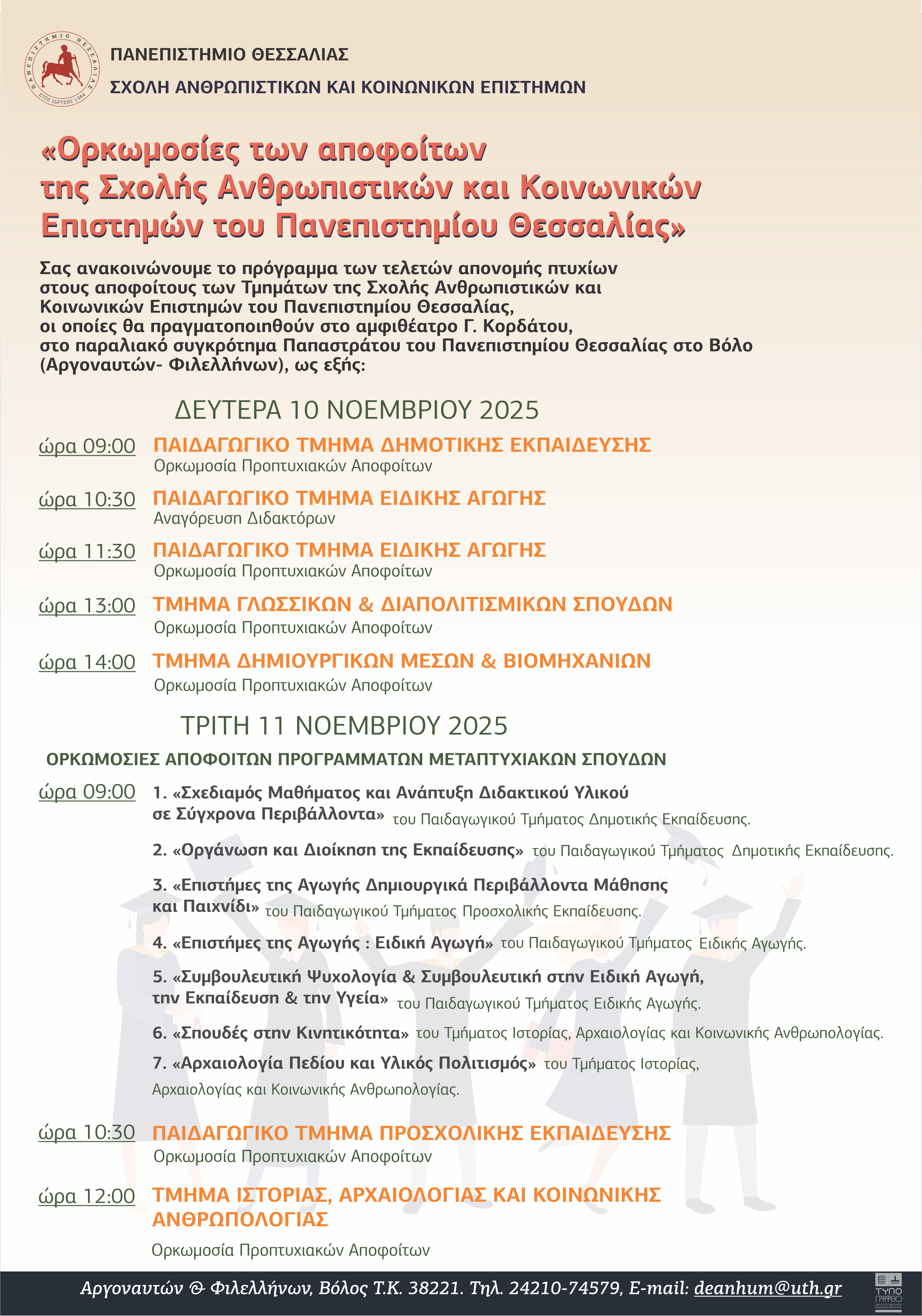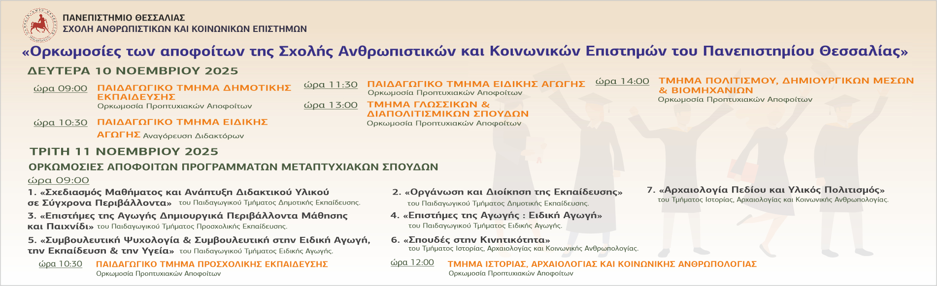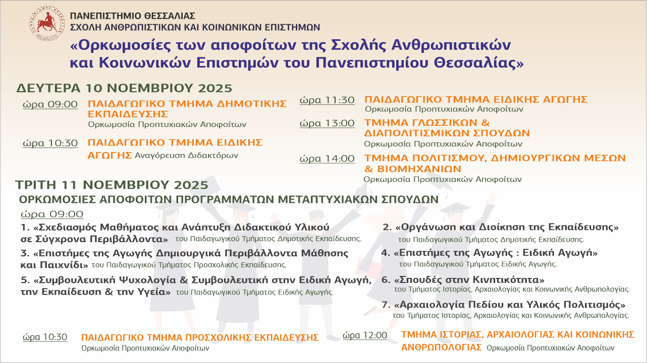 Σας ανακοινώνουμε το πρόγραμμα των τελετών απονομής πτυχίων στους αποφοίτους των Τμημάτων της Σχολής Ανθρωπιστικών και Κοινωνικών Επιστημών του Πανεπιστημίου Θεσσαλίας, οι οποίες θα πραγματοποιηθούν στο αμφιθέατρο Γ. Κορδάτου, στο παραλιακό συγκρότημα Παπαστράτου του Πανεπιστημίου Θεσσαλίας στο Βόλο (Αργοναυτών- Φιλελλήνων)
