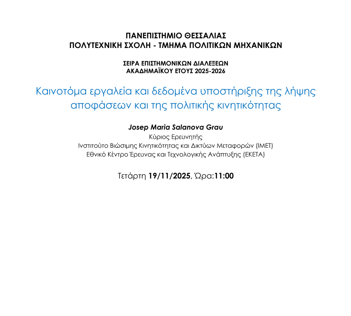 Το Τμήμα Πολιτικών Μηχανικών του Πανεπιστημίου Θεσσαλίας, στο πλαίσιο της Σειράς Επιστημονικών Διαλέξεων, πραγματοποιεί διαδικτυακά την επιστημονική διάλεξη του Κύριου Ερευνητή του Ινστιτούτου Βιώσιμης Κινητικότητας και Δικτύων Μεταφορών του Εθνικού Κέντρου Έρευνας και Τεχνολογικής Ανάπτυξης (ΙΜΕΤ-ΕΚΕΤΑ) Josep Maria Salanova Grau με θέμα «Καινοτόμα εργαλεία και δεδομένα υποστήριξης της λήψης αποφάσεων και της πολιτικής κινητικότητας».