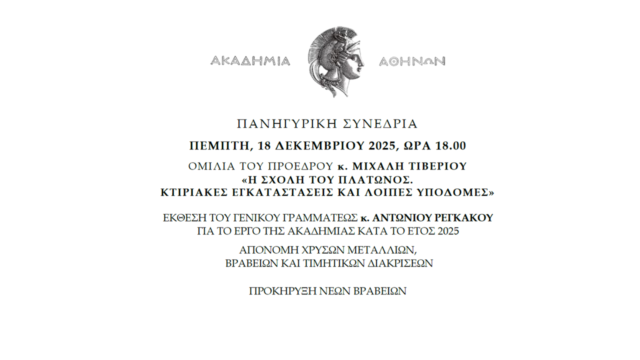 Πανηγυρική Συνεδρία της Ακαδημίας Αθηνών, η οποία θα πραγματοποιηθεί την Πέμπτη, 18 Δεκεμβρίου 2025 και ώρα 18.00, στην Αίθουσα Τελετών. Ο Πρόεδρος της Ακαδημίας Αθηνών, κ. Μιχάλης Τιβέριος, θα εκφωνήσει ομιλία με θέμα: «Η Σχολή του Πλάτωνος. Κτιριακές εγκαταστάσεις και λοιπές υποδομές». Ο Γενικός Γραμματέας, κ. Αντώνιος Ρεγκάκος, θα αναγνώσει την Έκθεση με θέμα το έργο της Ακαδημίας για το έτος 2025.