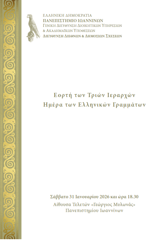 Η πρύτανης του πανεπιστημίου Ιωαννίνων, Καθηγήτρια κυρία Άννα Κ. Μπατιστάτου, σας προσκαλεί στην Εορτή των Τριών Ιεραρχών, Ημέρα των Ελληνικών Γραμμάτων, το Σάββατο 31 Ιανουαρίου 2026 και ώρα 18.30, στην Αίθουσα Τελετών «Γεώργιος Μυλωνάς» του πανεπιστημίου.