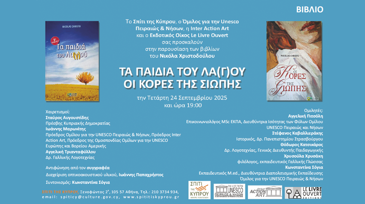 Το Σπίτι της Κύπρου o Όμιλος για την Unesco Πειραιώς & Νήσων η Ιnter Action Art και ο Εκδοτικός Οίκος Le Livre Ouvert σας προσκαλούν την Τετάρτη 24 Σεπτεμβρίου 2025 και ώρα 19:00 στην παρουσίαση των βιβλίων του Νικόλα Χριστοδούλου : «ΤΑ ΠΑΙΔΙΑ ΤΟΥ ΛΑ(Γ)ΟΥ. ΟΙ ΚΟΡΕΣ ΤΗΣ ΣΙΩΠΗΣ»