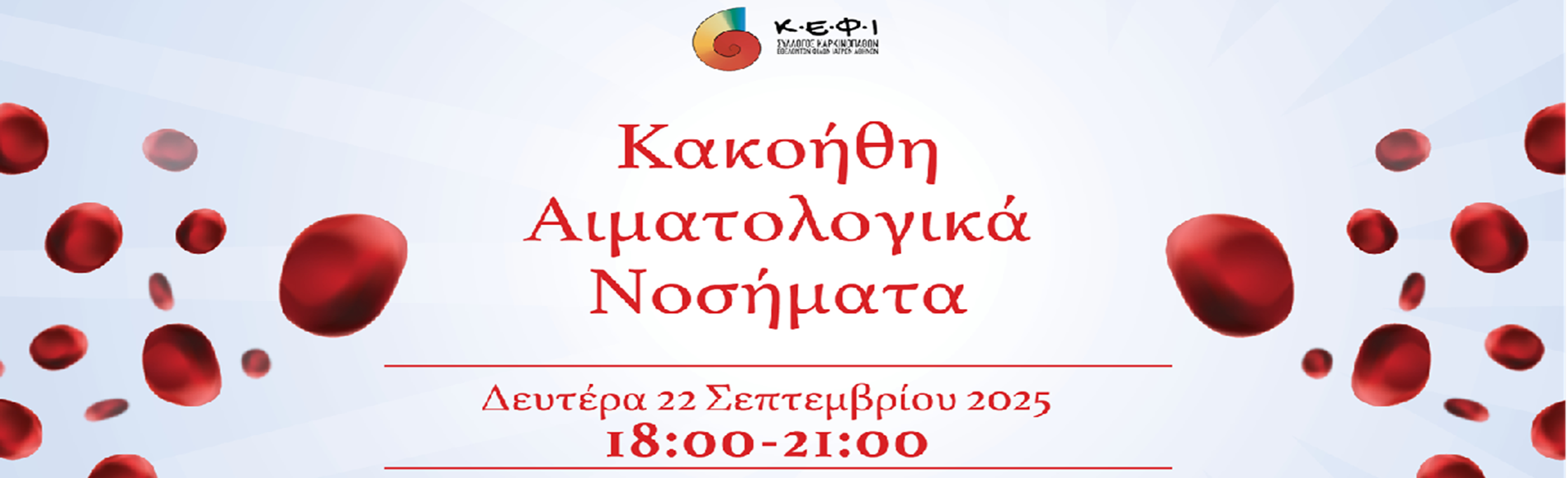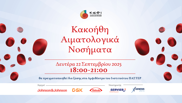 Ο Σύλλογος Καρκινοπαθών, Εθελοντών, Φίλων, Ιατρών «Κ.Ε.Φ.Ι.» διοργανώνει Επιστημονική Ημερίδα με θέμα «ΚΑΚΟΗΘΗ ΑΙΜΑΤΟΛΟΓΙΚΑ ΝΟΣΗΜΑΤΑ», η οποία θα πραγματοποιηθεί την Δευτέρα 22 Σεπτεμβρίου 2025 και ώρα 18:00 – 21:00 στο αμφιθέατρο του Ελληνικού Ινστιτούτο ΠΑΣΤΕΡ (Βασιλίσσης Σοφίας 127, Αθήνα 11521).
