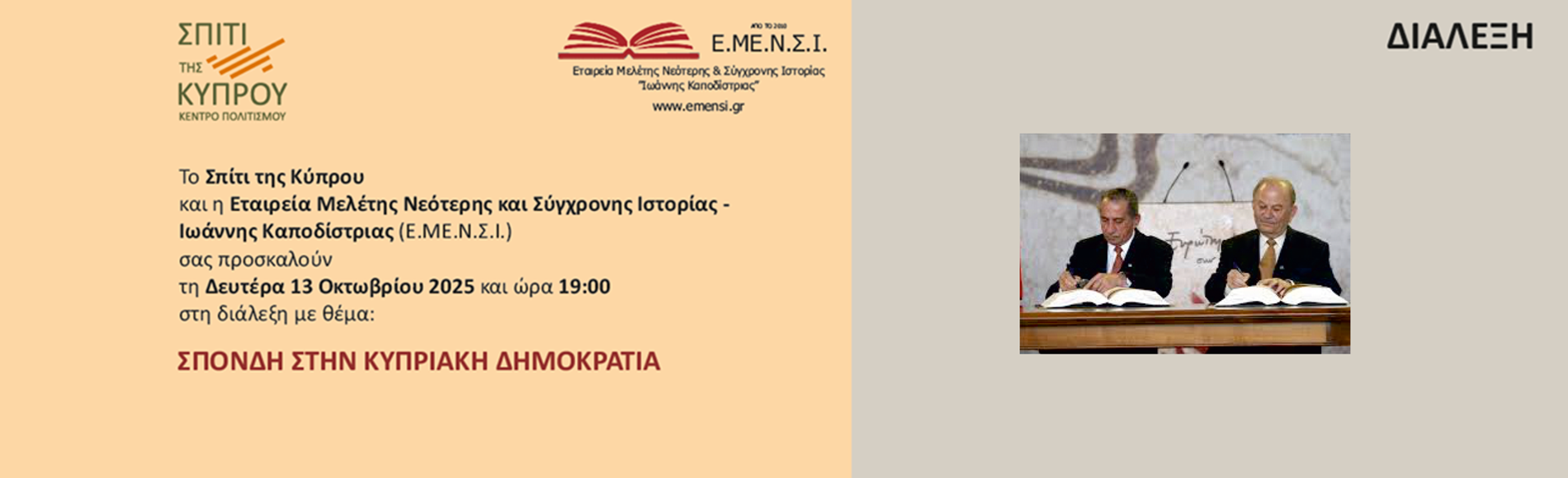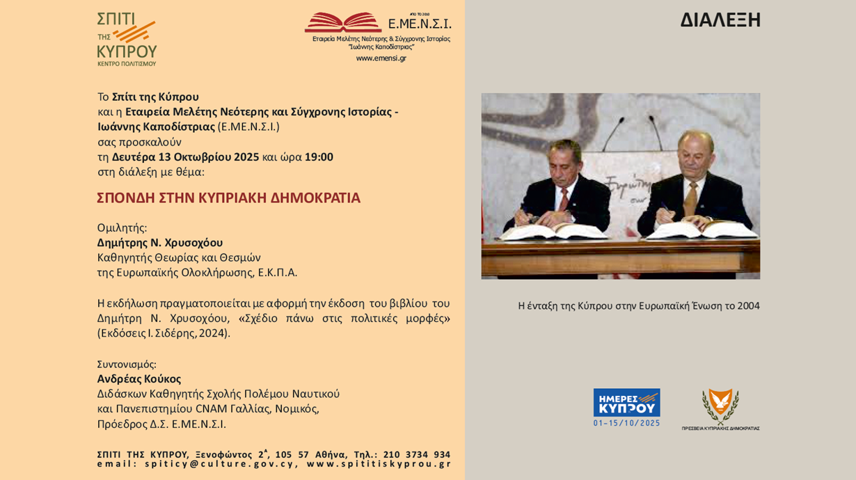 Το Σπίτι της Κύπρου και η Εταιρεία Μελέτης Νεότερης και Σύγχρονης Ιστορίας – Ιωάννης Καποδίστριας (Ε.ΜΕ.Ν.Σ.Ι.) σας προσκαλούν τη Δευτέρα 13 Οκτωβρίου 2025 και ώρα 19:00 στη διάλεξη με θέμα: «ΣΠΟΝΔΗ ΣΤΗΝ ΚΥΠΡΙΑΚΗ ΔΗΜΟΚΡΑΤΙΑ»