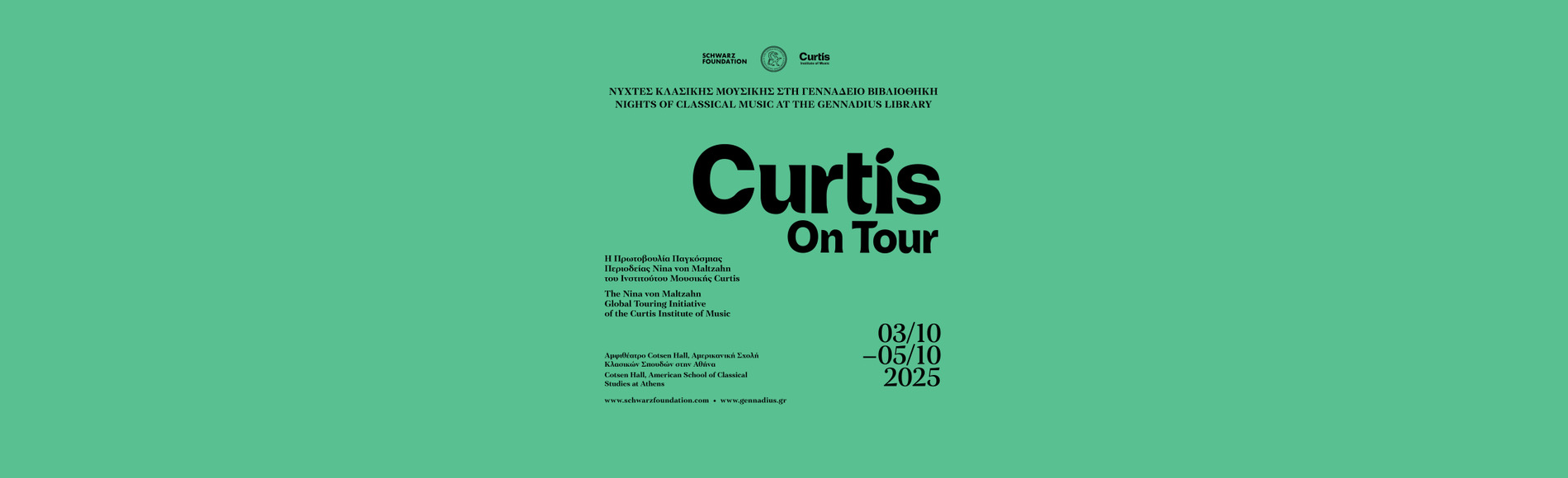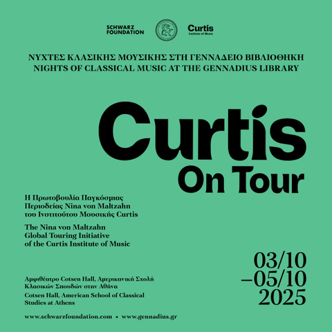 Η Γεννάδειος Βιβλιοθήκη της Αμερικανικής Σχολής Κλασικών Σπουδών στην Αθήνα και το Ίδρυμα Schwarz παρουσιάζουν για 11η συνεχή χρονιά τις «Νύχτες Κλασικής Μουσικής στη Γεννάδειο Βιβλιοθήκη». Από τις 3 έως και τις 5 Οκτωβρίου, τo Curtis on Tour, η πρωτοβουλία παγκόσμιας περιοδείας Nina von Maltzahn του Ινστιτούτου Μουσικής Curtis, έρχεται και πάλι στην Αθήνα με ένα ονειρικό φεστιβάλ μουσικής δωματίου, όπως κάθε φθινόπωρο από το 2015. Σας περιμένουμε για να παρακολουθήσουμε μαζί τρεις συναυλίες με τις σοπράνο Νικάν Ινγκαμπίρε Κανατέ και Τζέισλα Ροσάριο Σάντος, τον βαρύτονο Εμίλιο Βάσκες, την κιθαρίστα Ξίνγκξινγκ Γιάο, και τον πιανίστα Κάρλις Μπουκόφσκις.