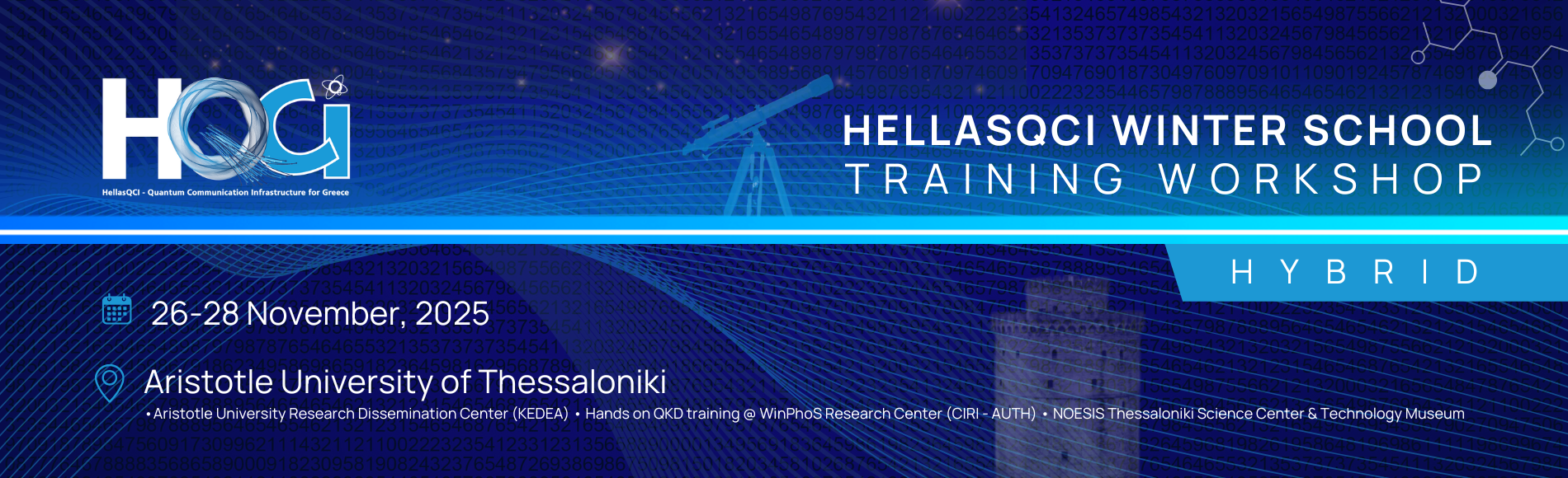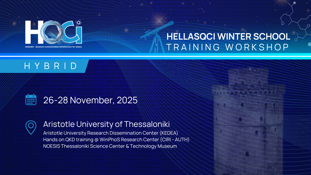 Continuing the successful series of training events in Athens and Crete, HellasQCI – a European co-funded project coordinated by GRNET – is proudly launching the HellasQCI Winter School (Training Workshop) 2025, in Thessaloniki; a FREE three-day training workshop on Quantum Key Distribution (QKD) and Space-based QKD technologies, combining theory, hands-on lab experience, and expert-led sessions.