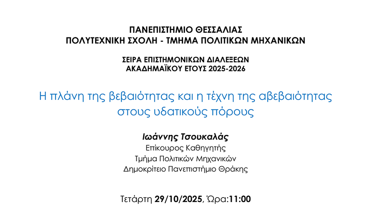Το Τμήμα Πολιτικών Μηχανικών του Πανεπιστημίου Θεσσαλίας, στο πλαίσιο της Σειράς Επιστημονικών Διαλέξεων, πραγματοποιεί διαδικτυακά την επιστημονική διάλεξη του Επίκουρου Καθηγητή του Δημοκρίτειου Πανεπιστήμιου Θράκης Ιωάννη Τσουκαλά με θέμα «Η πλάνη της βεβαιότητας και η τέχνη της αβεβαιότητας στους υδατικούς πόρους».