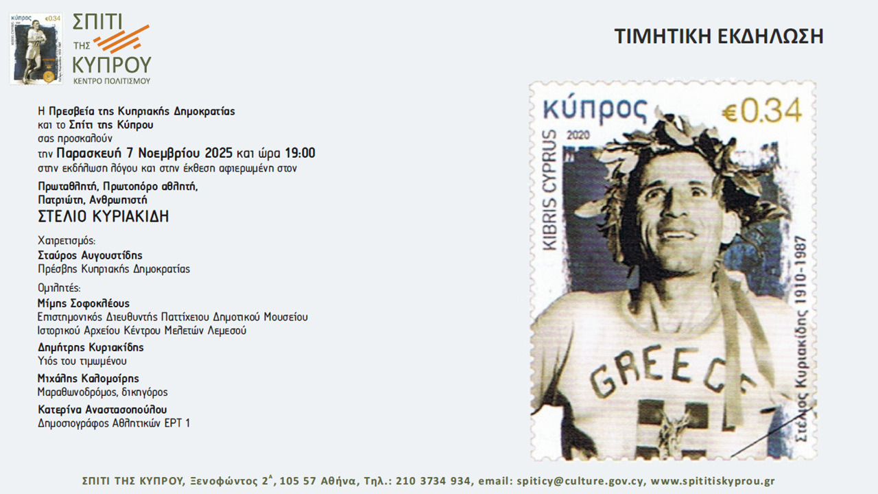 Η Πρεσβεία της Κυπριακής Δημοκρατίας και το Σπίτι της Κύπρου σας προσκαλούν την Παρασκευή 7 Νοεμβρίου 2025 και ώρα 19:00 στην εκδήλωση λόγου και στην έκθεση αφιερωμένη στον Πρωταθλητή, Πρωτοπόρο αθλητή, Πατριώτη, Ανθρωπιστή Στέλιο Κυριακίδη