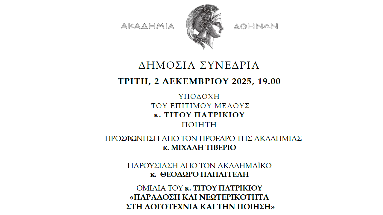 Συνεδρία υποδοχής του κ. Τίτου Πατρίκιου, ποιητή, ως επίτιμου μέλους της Ακαδημίας Αθηνών. Η συνεδρία θα πραγματοποιηθεί την Τρίτη, 2 Δεκεμβρίου 2025 και ώρα 19.00, στην Αίθουσα Τελετών.