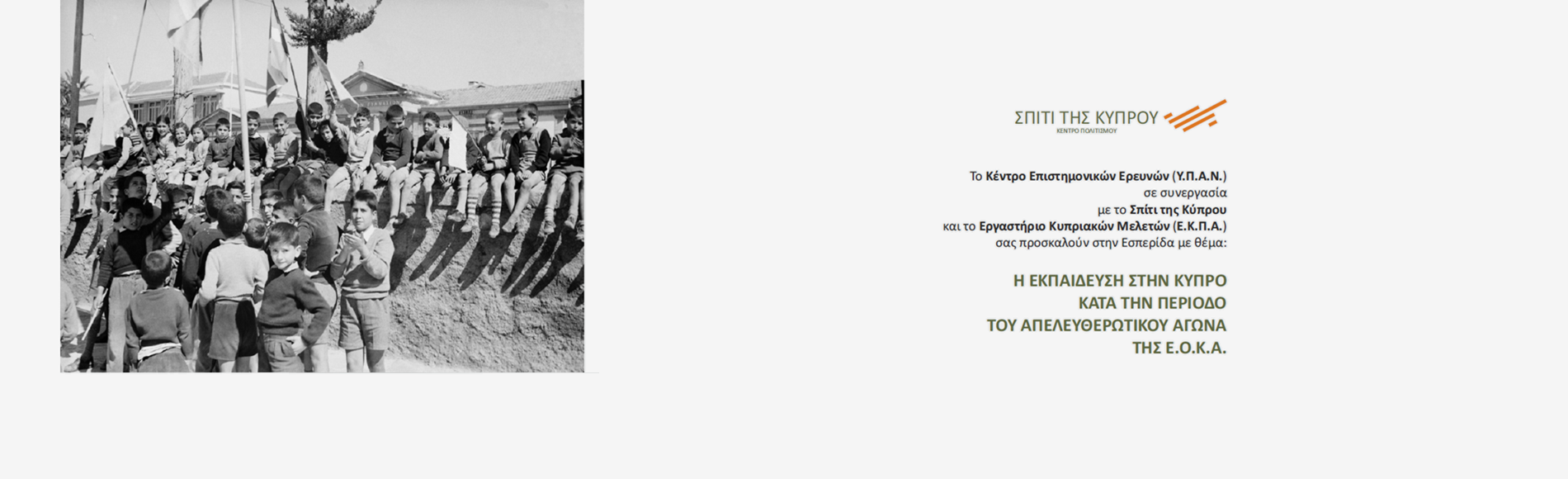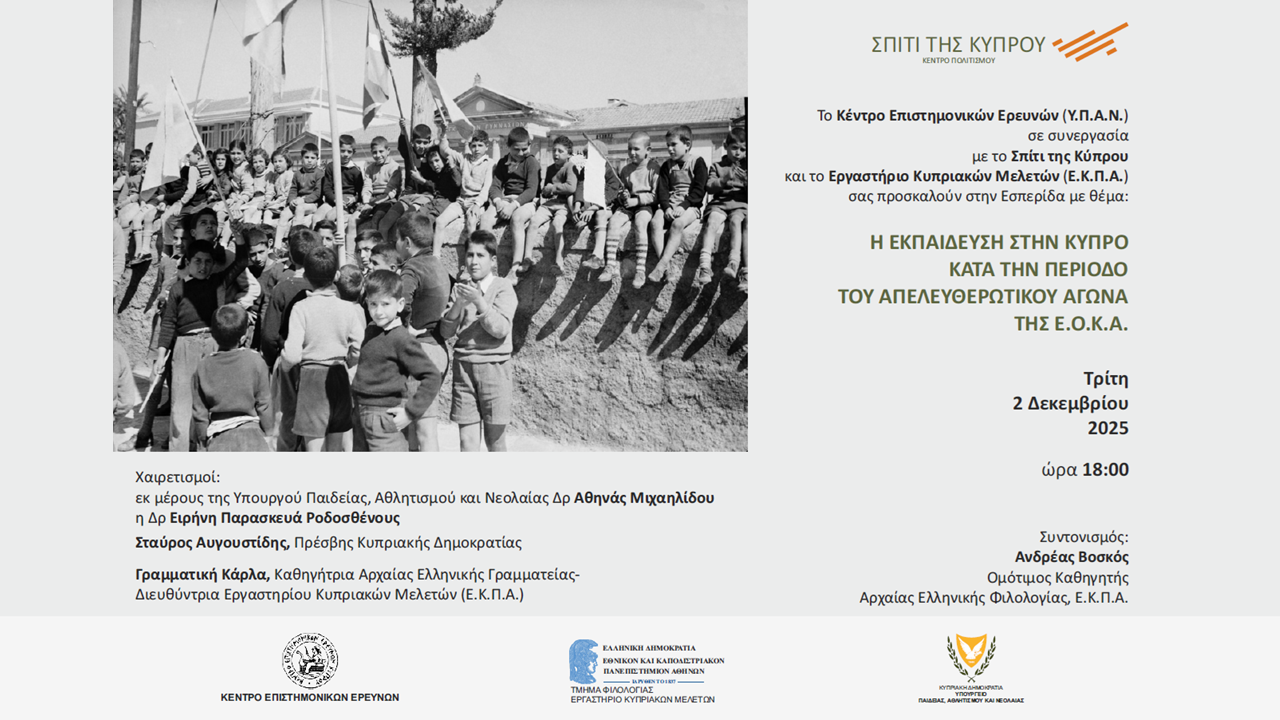 Το Κέντρο Επιστημονικών Ερευνών (Υ.Π.Α.Ν.) σε συνεργασία µε το Σπίτι της Κύπρου και το Εργαστήριο Κυπριακών Μελετών (Ε.Κ.Π.Α.) σας προσκαλούν στην Εσπερίδα με θέμα: «Η ΕΚΠΑΙΔΕΥΣΗ ΣΤΗΝ ΚΥΠΡΟ ΚΑΤΑ ΤΗΝ ΠΕΡΙΟΔΟ ΤΟΥ ΑΠΕΛΕΥΘΕΡΩΤΙΚΟΥ ΑΓΩΝΑ ΤΗΣ Ε.Ο.Κ.Α.»