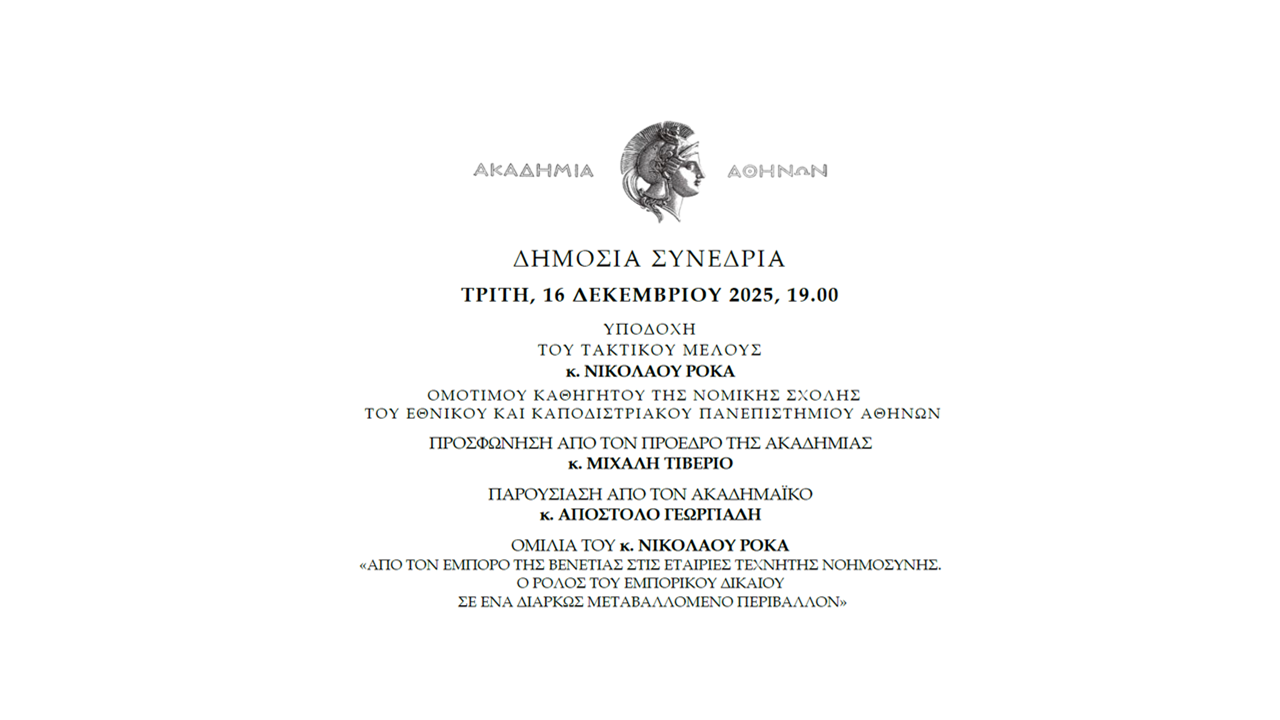 Συνεδρία υποδοχής του κ. Νικολάου Ρόκα, Ομότιμου Καθηγητή της Νομικής Σχολής του Εθνικού και Καποδιστριακού Πανεπιστημίου Αθηνών, ως τακτικού μέλους της Ακαδημίας Αθηνών. Η συνεδρία θα πραγματοποιηθεί την Τρίτη, 16 Δεκεμβρίου 2025 και ώρα 19.00, στην Αίθουσα Τελετών.