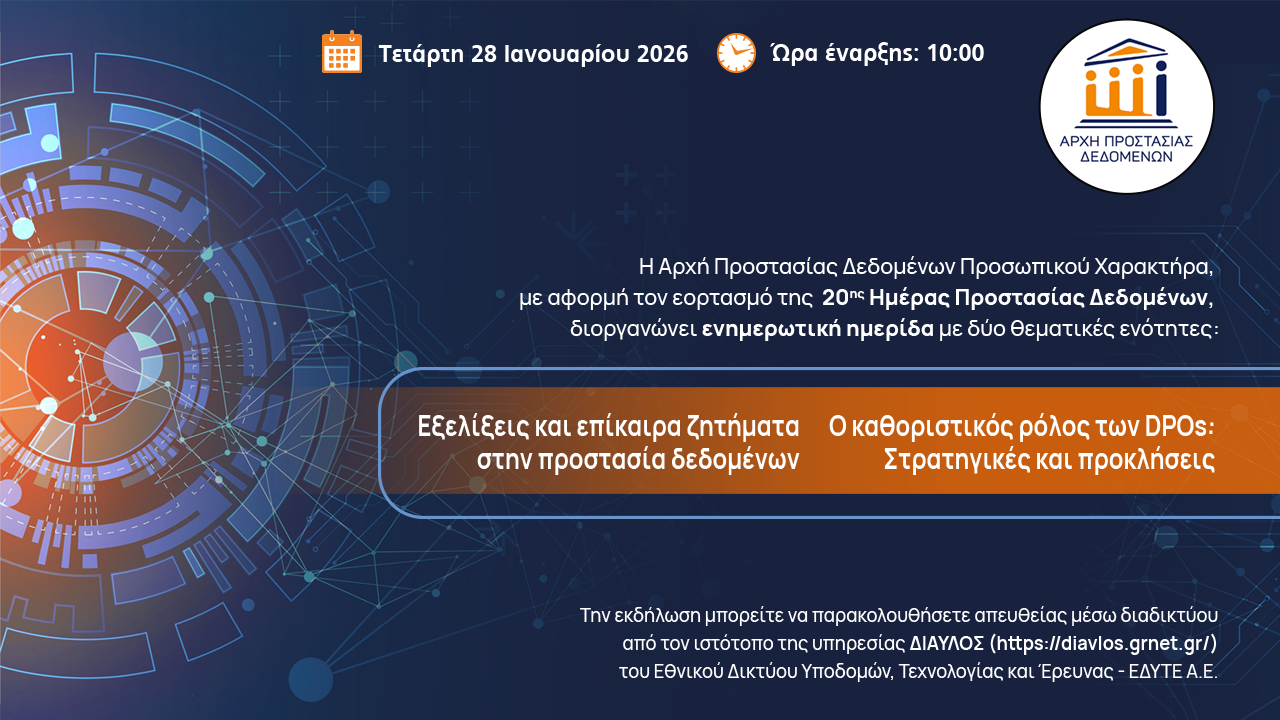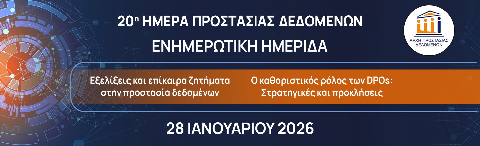 Mε αφορμή τον εορτασμό της 20ης Ημέρας Προστασίας Δεδομένωνη Αρχή Προστασίας Δεδομένων πραγματοποιεί την Τετάρτη 28 Ιανουαρίου 2026 στην αίθουσα «Ερμής» του Εμπορικού και Βιομηχανικού Επιμελητηρίου Αθηνών (Ακαδημίας 7) ενημερωτική ημερίδα με δύο θεματικές ενότητες: