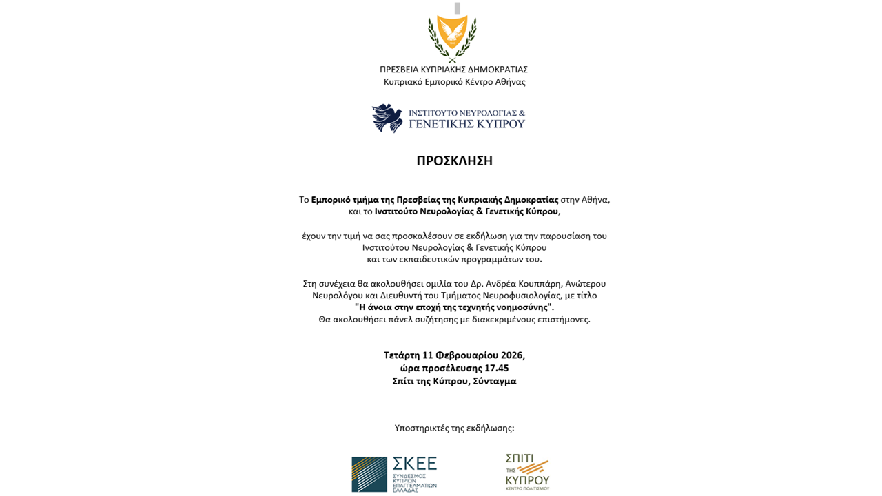 Το Εμπορικό τμήμα της Πρεσβείας της Κυπριακής Δημοκρατίας στην Αθήνα, και το Ινστιτούτο Νευρολογίας & Γενετικής Κύπρου, έχουν την τιμή να σας προσκαλέσουν σε εκδήλωση για την παρουσίαση του Ινστιτούτου Νευρολογίας & Γενετικής Κύπρου και των εκπαιδευτικών προγραμμάτων του.