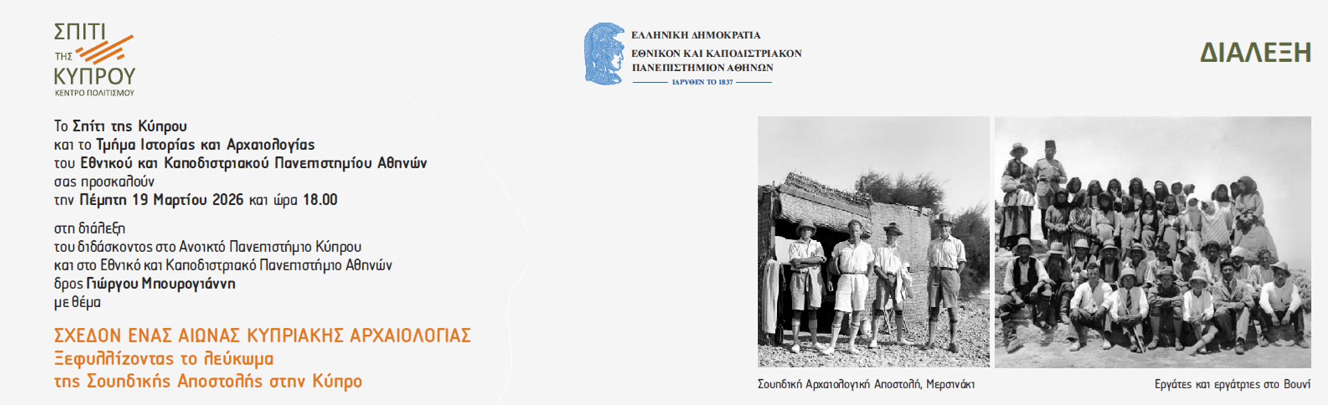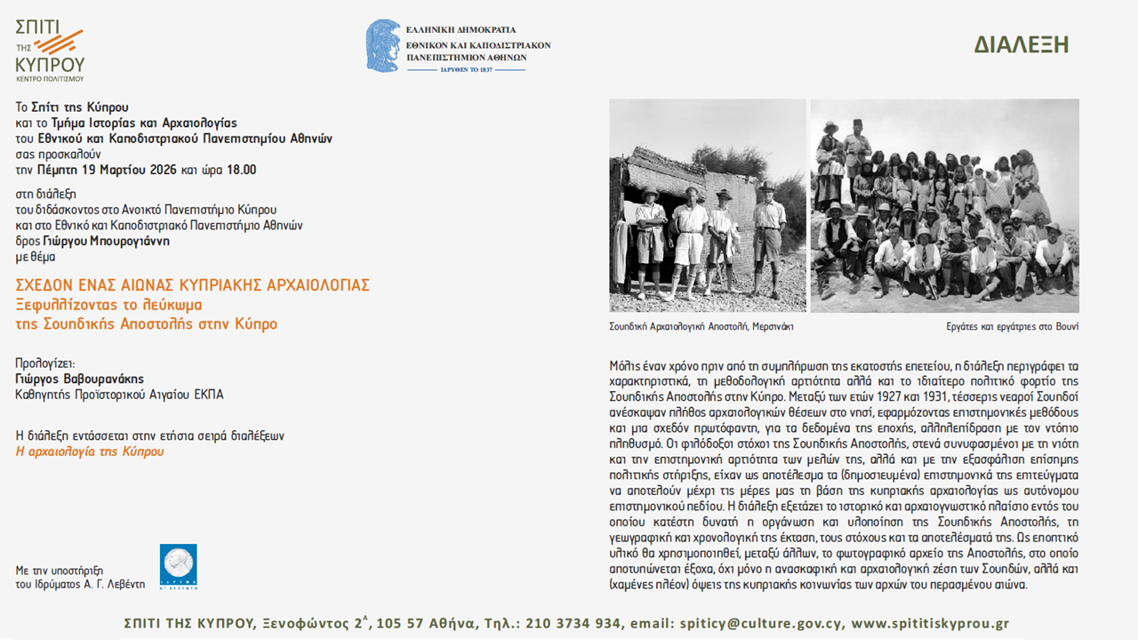 Το Σπίτι της Κύπρου και το Τμήμα Ιστορίας και Αρχαιολογίας του Εθνικού και Καποδιστριακού Πανεπιστημίου Αθηνών σας προσκαλούν την Πέμπτη 19 Μαρτίου 2026 και ώρα 18.00 στη διάλεξη του διδάσκοντος στο Ανοικτό Πανεπιστήμιο Κύπρου και στο Εθνικό και Καποδιστριακό Πανεπιστήμιο Αθηνών δρος Γιώργου Μπουρογιάννη με θέμα: « ΣΧΕΔΟΝ ΕΝΑΣ ΑΙΩΝΑΣ ΚΥΠΡΙΑΚΗΣ ΑΡΧΑΙΟΛΟΓΙΑΣ. Ξεφυλλίζοντας το λεύκωμα της Σουηδικής Αποστολής στην Κύπρο»