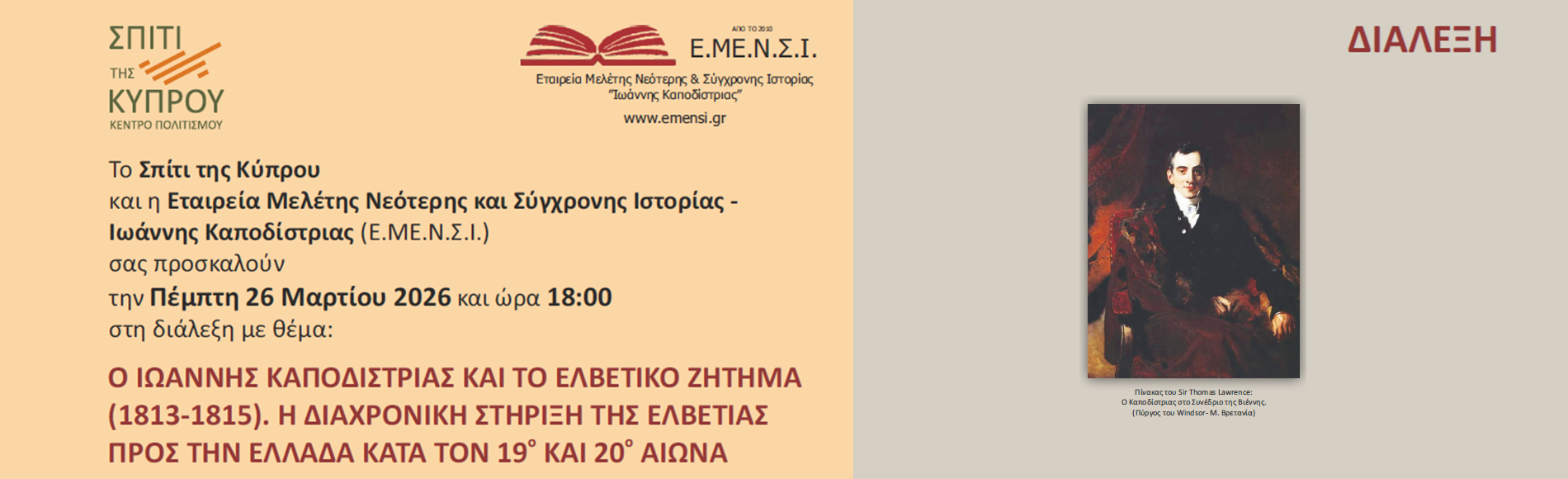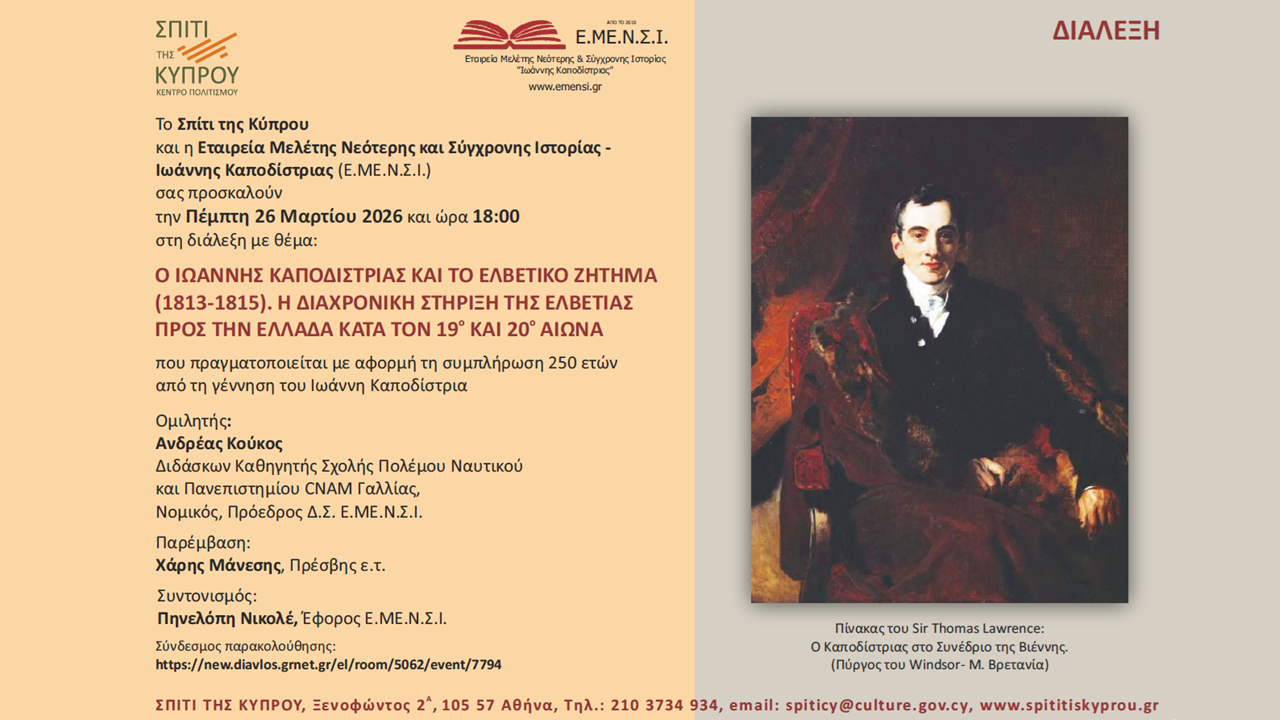 Το Σπίτι της Κύπρου και η Εταιρεία Μελέτης Νεότερης και Σύγχρονης Ιστορίας – Ιωάννης Καποδίστριας (Ε.ΜΕ.Ν.Σ.Ι.) σας προσκαλούν την Πέμπτη 12 Μαρτίου 2026 και ώρα 18:00 στη διάλεξη με θέμα: «Ο ΙΩΑΝΝΗΣ ΚΑΠΟΔΙΣΤΡΙΑΣ ΚΑΙ ΤΟ ΕΛΒΕΤΙΚΟ ΖΗΤΗΜΑ (1813-1815). Η ΔΙΑΧΡΟΝΙΚΗ ΣΤΗΡΙΞΗ ΤΗΣ ΕΛΒΕΤΙΑΣ ΠΡΟΣ ΤΗΝ ΕΛΛΑΔΑ ΚΑΤΑ ΤΟΝ 19ο ΚΑΙ 20ο ΑΙΩΝΑ» που πραγματοποιείται με αφορμή τη συμπλήρωση 250 ετών από τη γέννηση του Ιωάννη Καποδίστρια