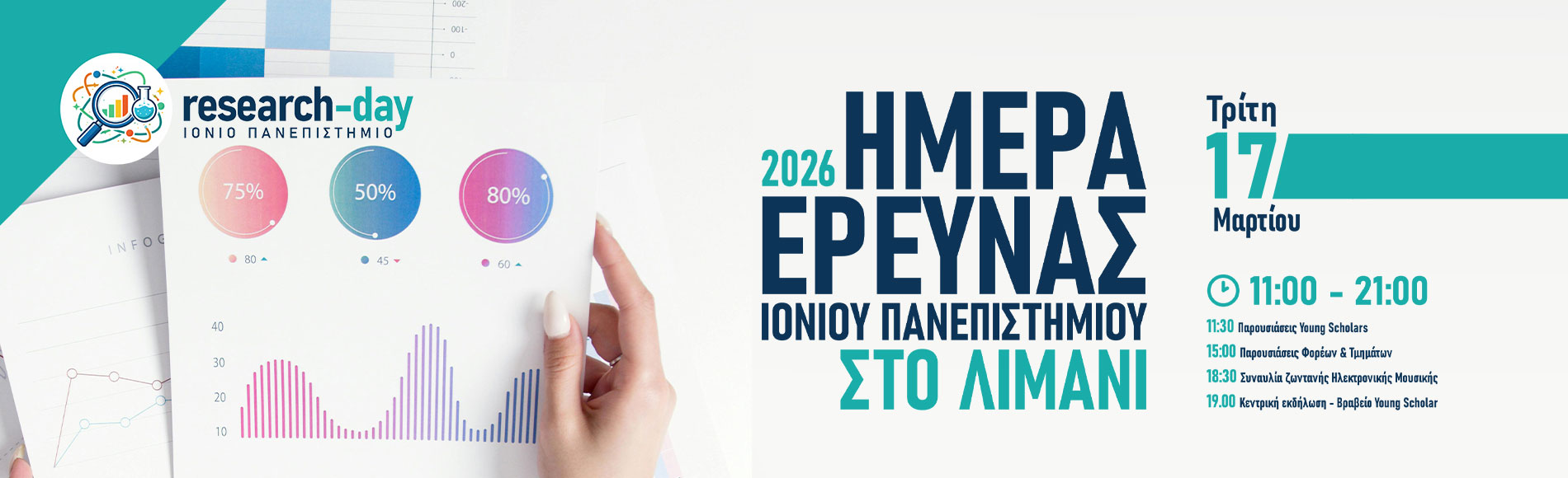 Το Ιόνιο Πανεπιστήμιο διοργανώνει την Ημέρα Έρευνας 2026 την Τρίτη 17 Μαρτίου 2026, μια ανοικτή εκδήλωση αφιερωμένη στην προβολή της επιστημονικής γνώσης, της δημιουργικότητας και της καινοτομίας που παράγεται στο Ίδρυμα.