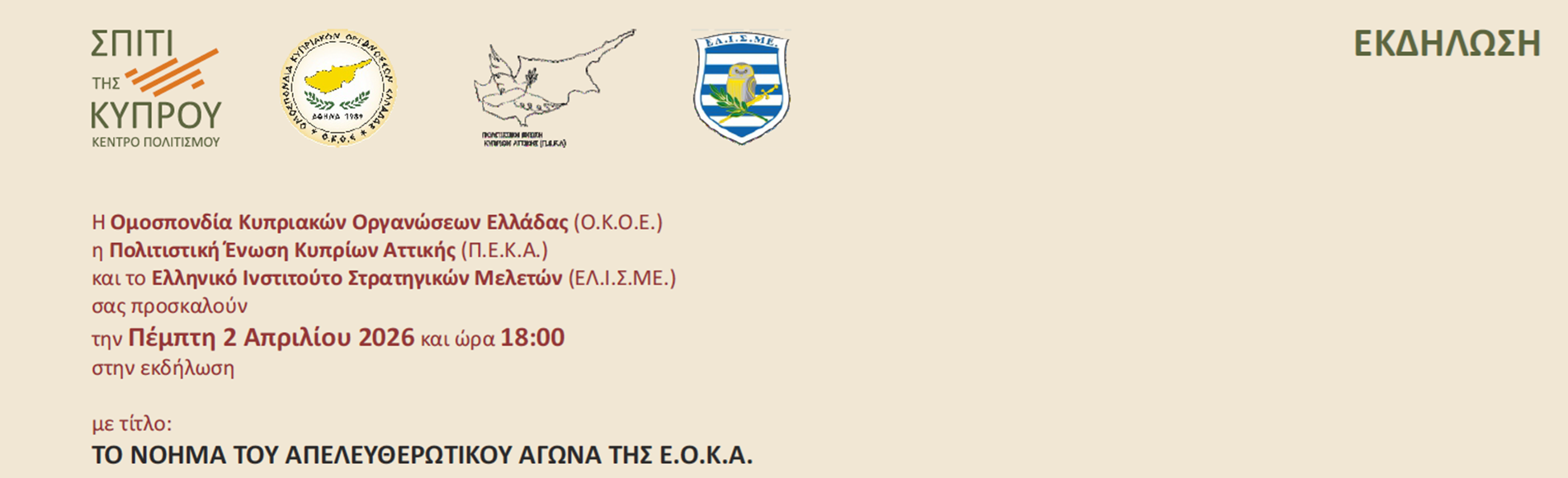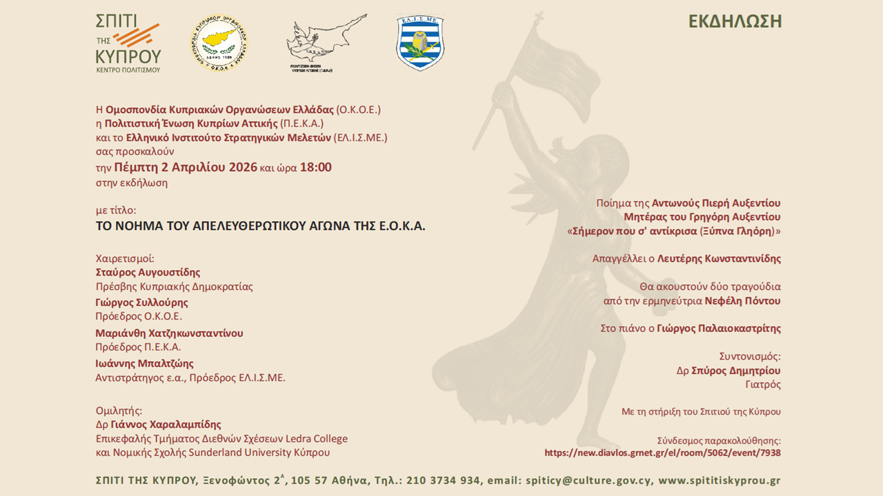 Η Ομοσπονδία Κυπριακών Οργανώσεων Ελλάδας (Ο.Κ.Ο.Ε.) και η Πολιτιστική Ένωση Κυπρίων Αττικής (Π.Ε.Κ.Α.) σας προσκαλούν την Πέμπτη 2 Απριλίου 2026 και ώρα 18:00 στην εκδήλωση με τίτλο: «ΤΟ ΝΟΗΜΑ ΤΟΥ ΑΠΕΛΕΥΘΕΡΩΤΙΚΟΥ ΑΓΩΝΑ ΤΗΣ Ε.Ο.Κ.Α.»